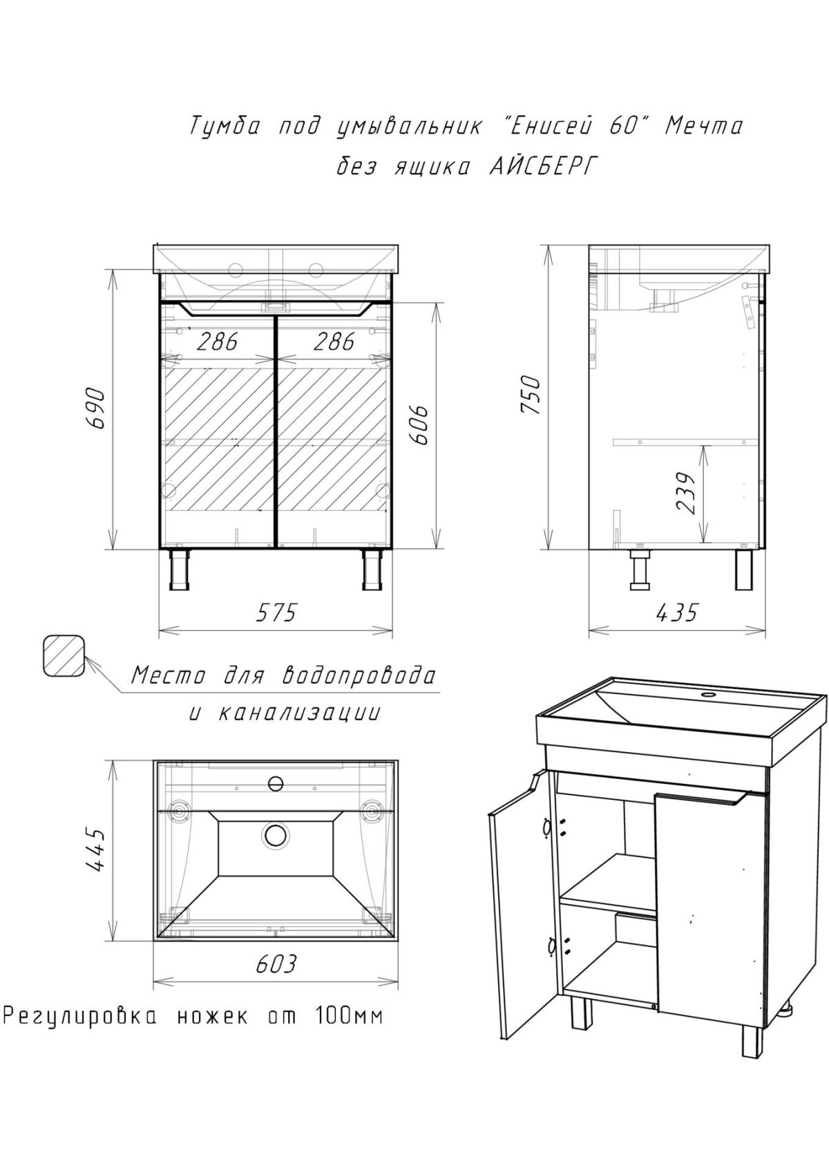 Тумба под умывальник "Енисей 60" Мечта без ящика АЙСБЕРГ (DM2309T)